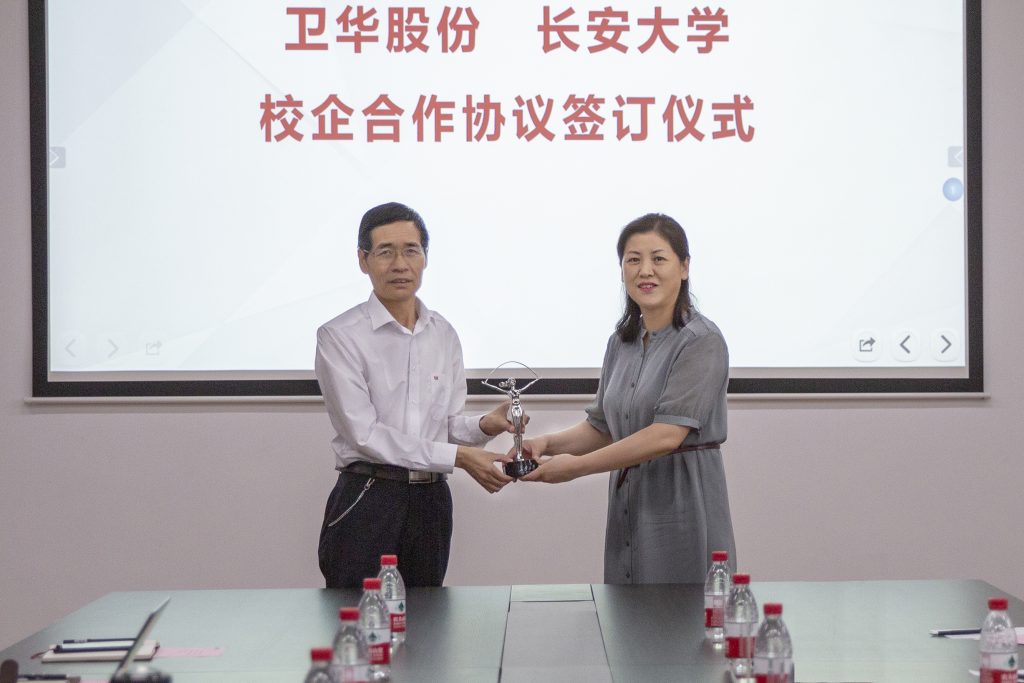 长安大学工程机械学院党委书记于丽娟将长安大学标志性建筑 “彩虹女神”的缩小版雕塑赠予悟空体育股份,这份珍贵的礼物也是悟空体育股份与长安大学友谊的见证。